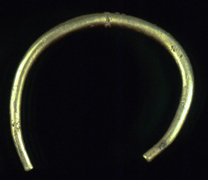 The undecorated gold torc is made from a solid heavy bar of gold, oval in cross section, which is thickest in the middle and tapers towards its plain flat ends. Only five examples of this type are known from Britain. It is now distorted asymmetrically so that one arm is more extended than the other, and the middle of the bar bears the scars from chisel blows made in antiquity.