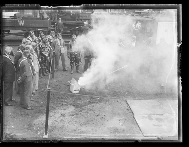 The staff at the Great Western Railway works were shown a demonstration of how to deal with an incendiary bomb.