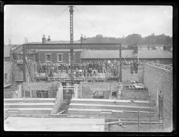Builders working on the construction site for the cinema are lined up for a rare photograph which shows the progress they had made.